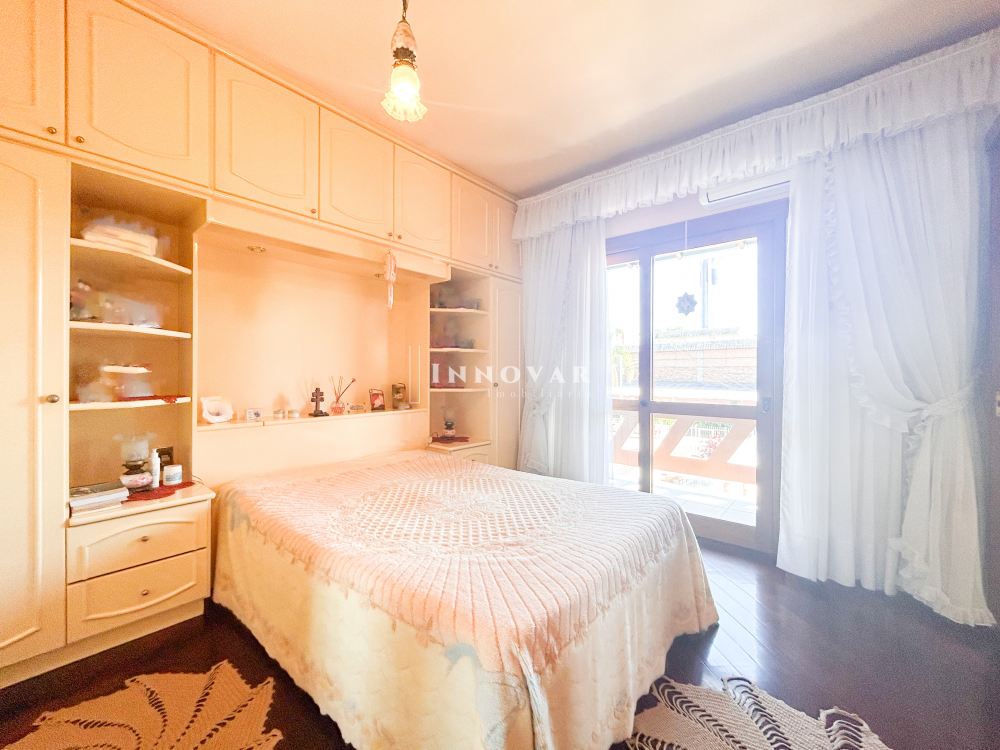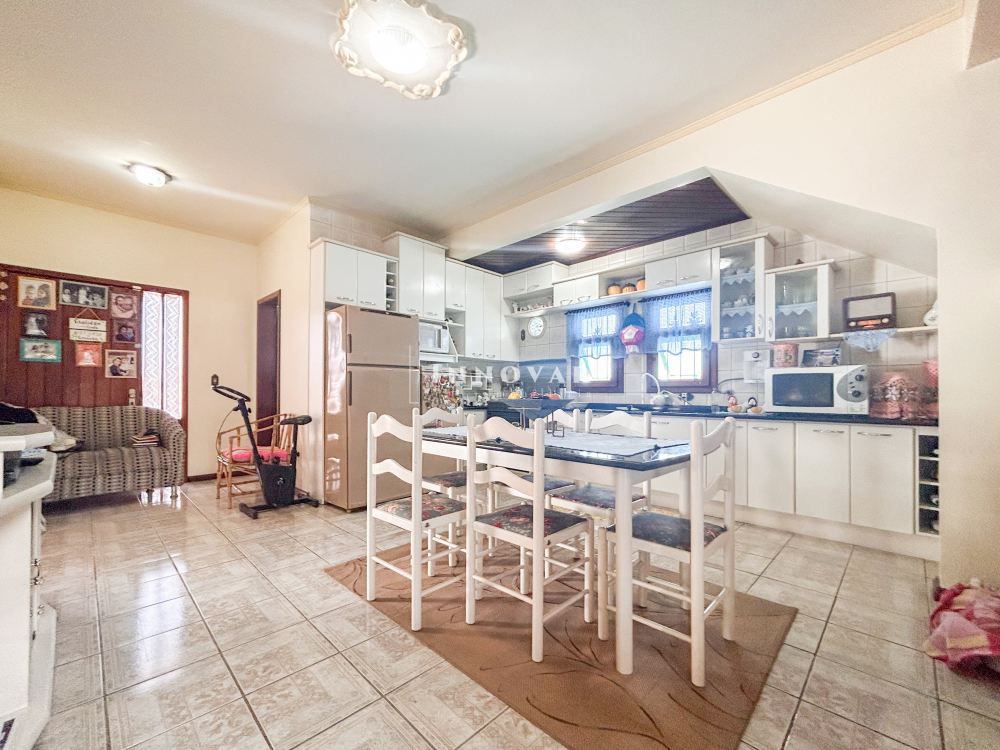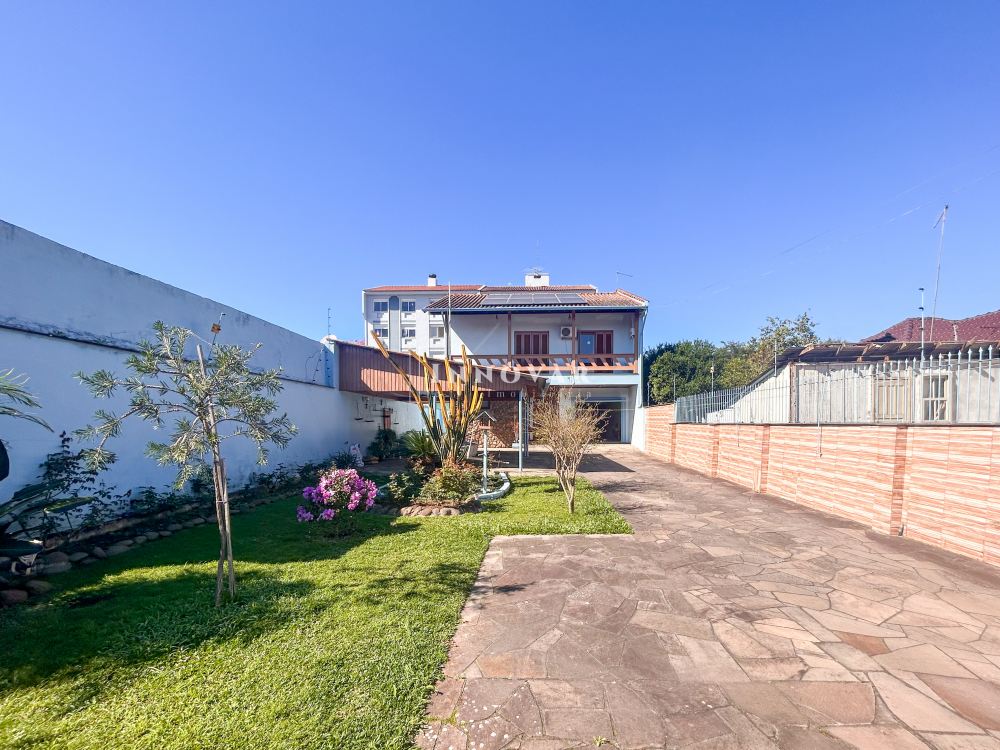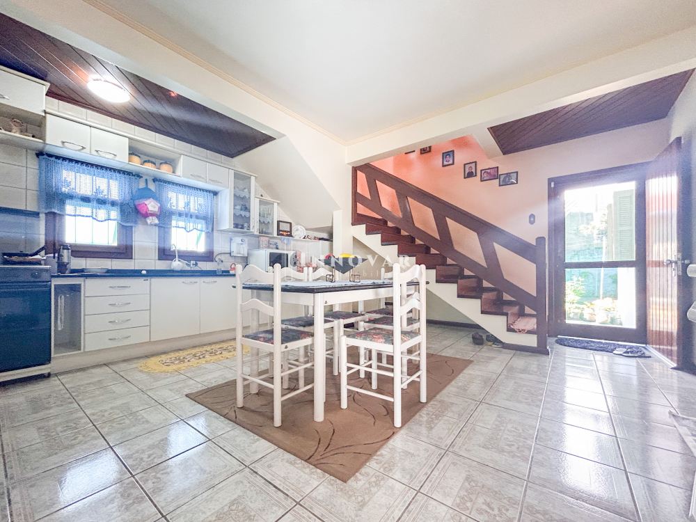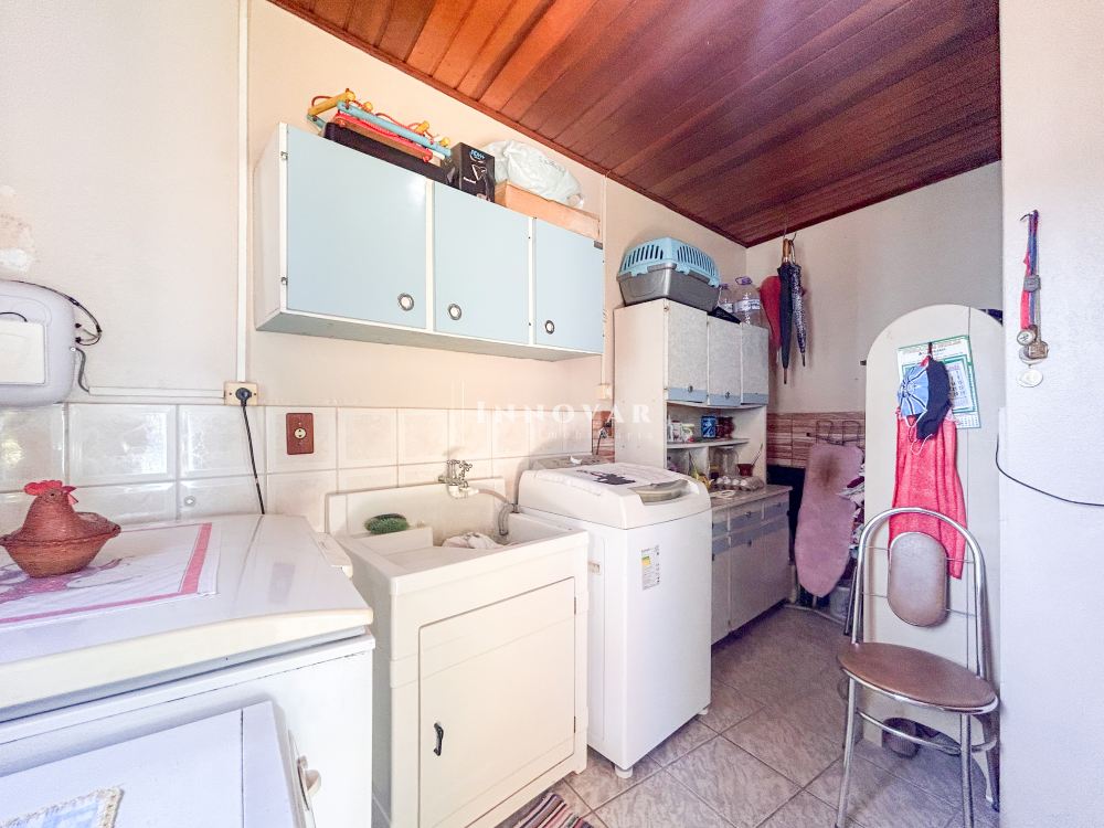 O pavimento térreo possui uma ampla cozinha com copa, 1 quarto, 2 banheiros e garagem. Nos fundos, um anexo com churrasqueira, lavanderia e lavabo.