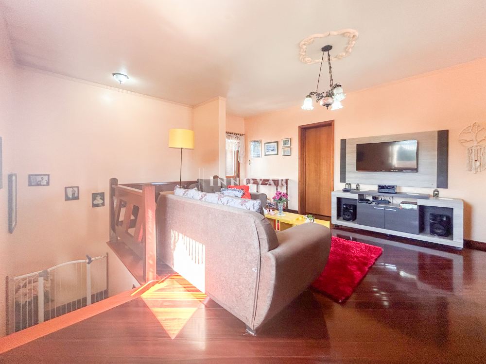 O pavimento superior possui sala de estar, 2 quartos, 1 banheiro, sacada com acesso pelo estar e um dos quartos.